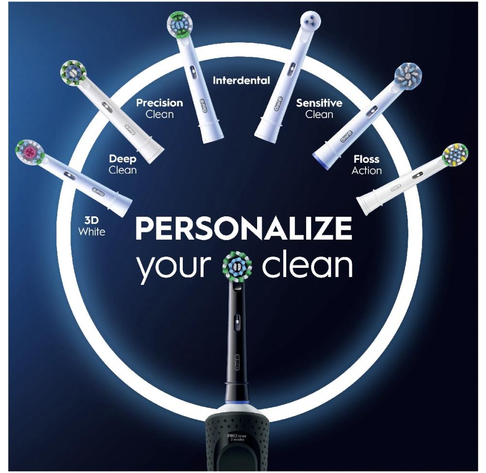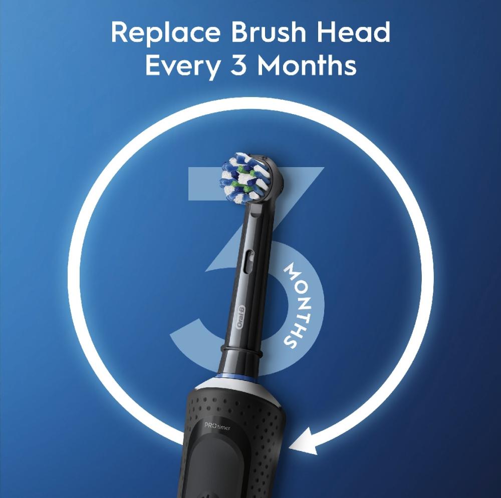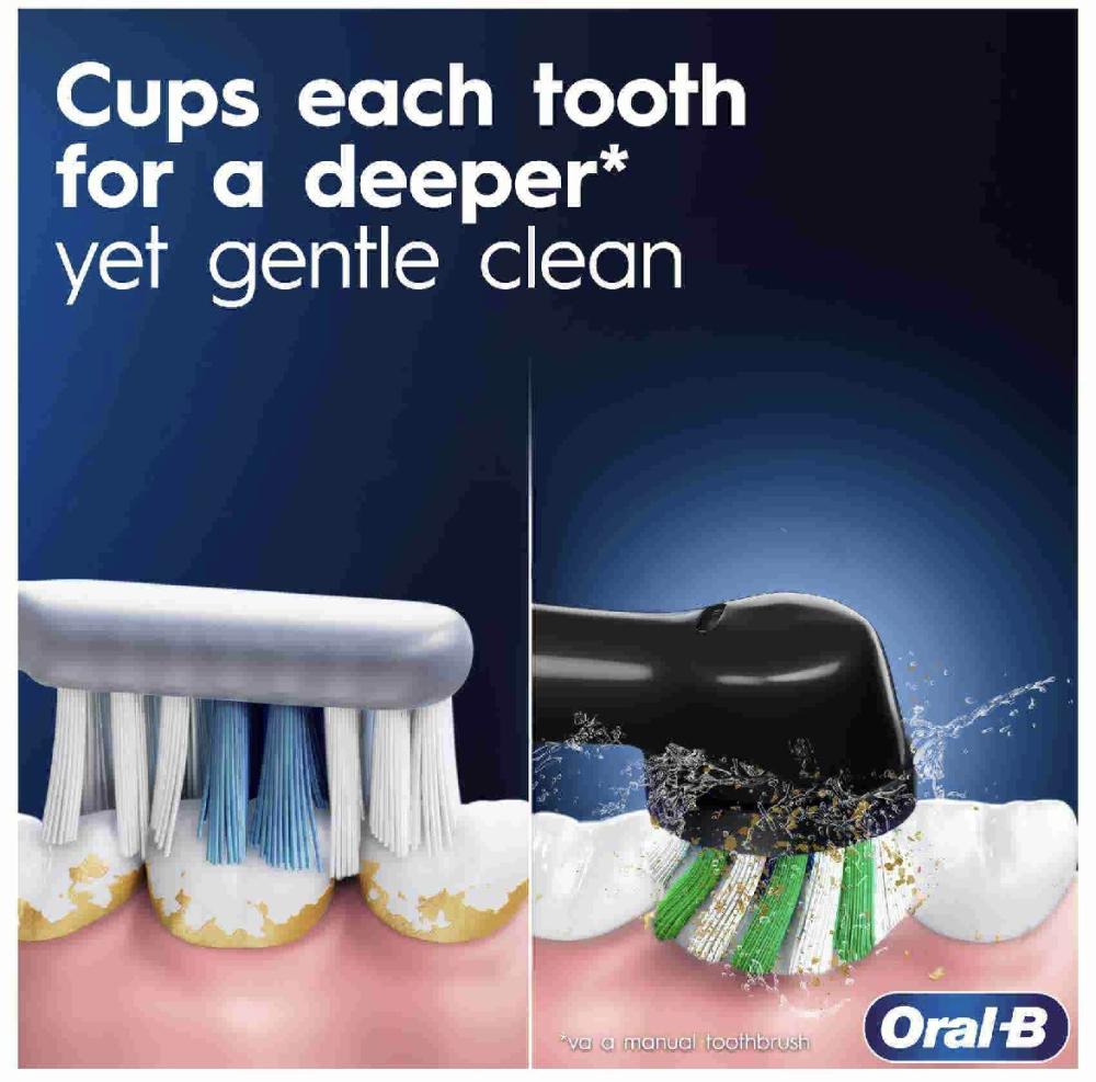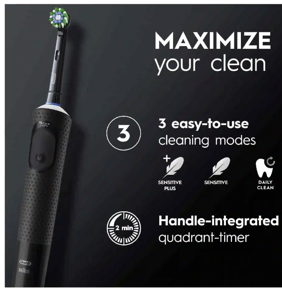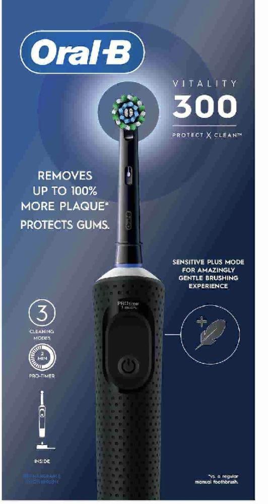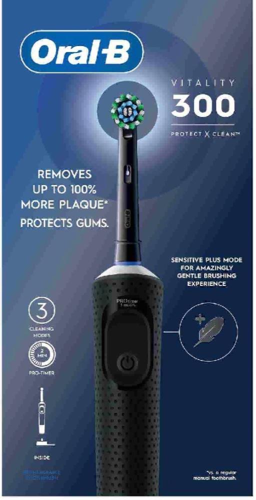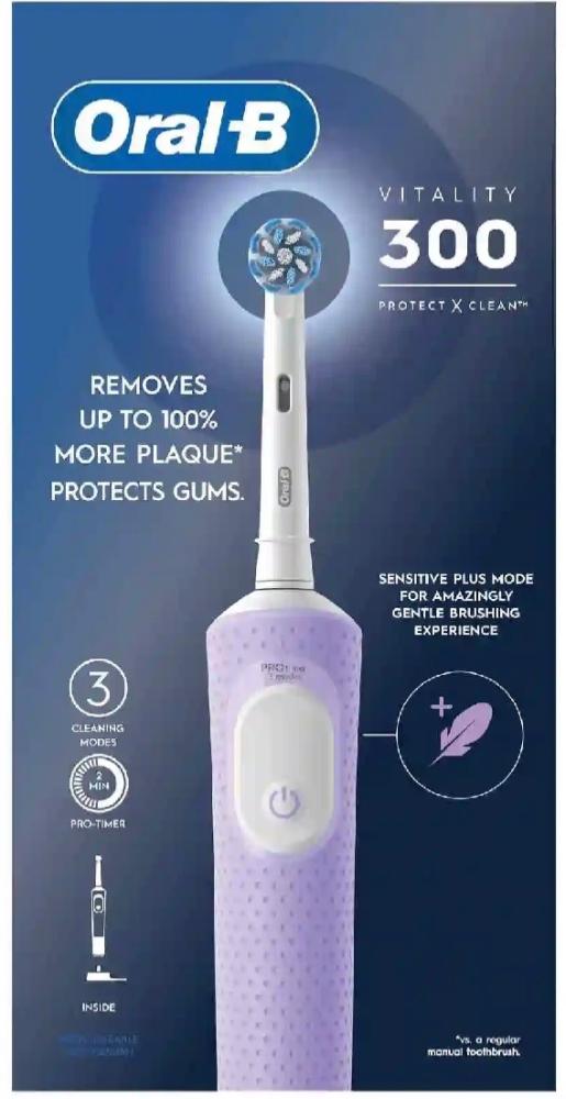 ان فرشاه اورال -بي 103 فيتاليتي 300 مصممة بشكل مثالي لتنظف اسنانك وتحميها . فهي تساعد على ازالة 100% اكثر من الجير مقارنه بفرشاه الاسنان اليدويه العادية.